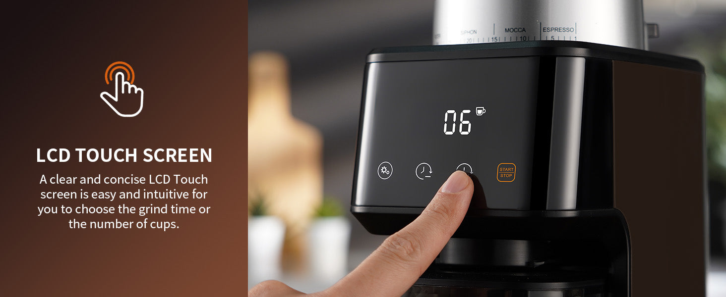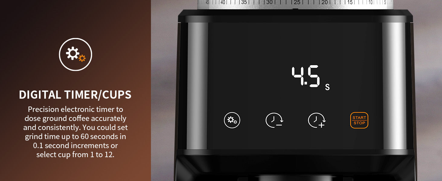 - Precision Cup Quantification and Electronic Timer: The cup number can be selected from 1 to 12 cups. Precision Electronic Timer allows you to adjust grind time up to 60 seconds in 0.1 second increments and consistent dose every time.