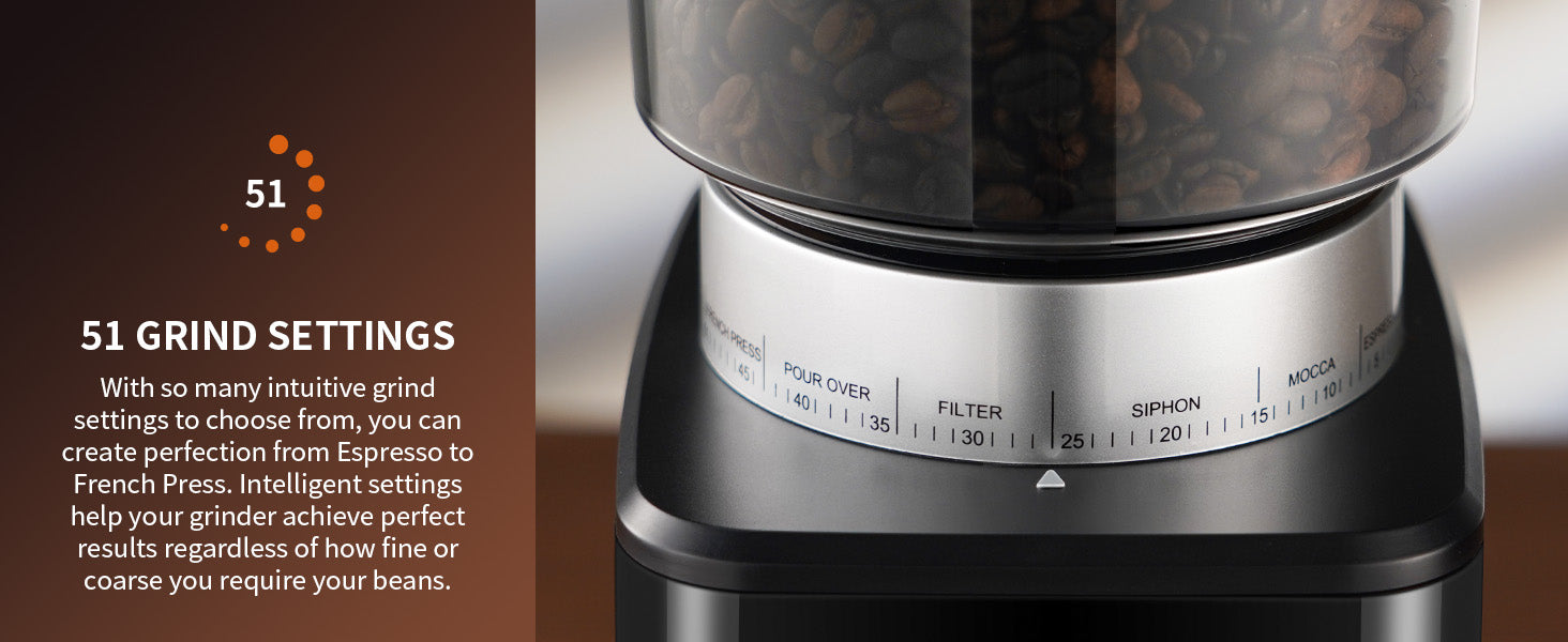 - 51 Precise Grind Settings: Adjustable from the finest for Espresso to the coarsest for French Press Grind.