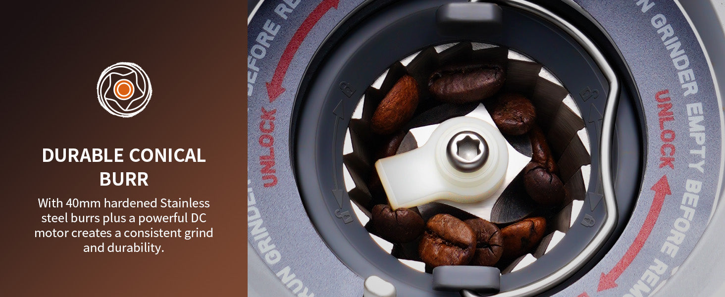 - Premium 40 Millimeter Stainless Steel Conical Burr: Designed to minimize grinding heat and protect the essential oils in the coffee bean, creating uniform grounds for optimal flavor extraction.