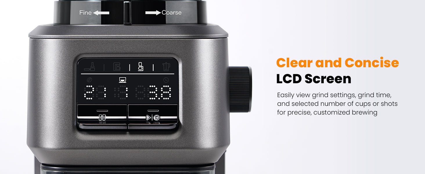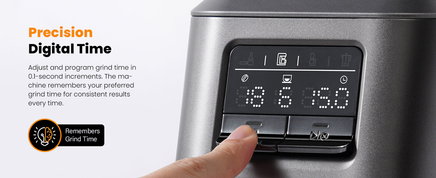 - Digital Control Panel: The front-mounted LCD display is user-friendly, allowing grind time settings within 0.1 seconds. Press START, and the grinder delivers precise dosing automatically.