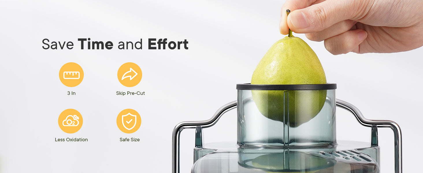 - [Save Prep Time] – The 3-inch extra-wide feed chute allows you to skip pre-cutting and juice whole fruits and vegetables with ease. The juicer features a simple, step-by-step installation, making it user-friendly for all ages. Designed for convenience, it helps you and your family enjoy fresh, healthy juice faster