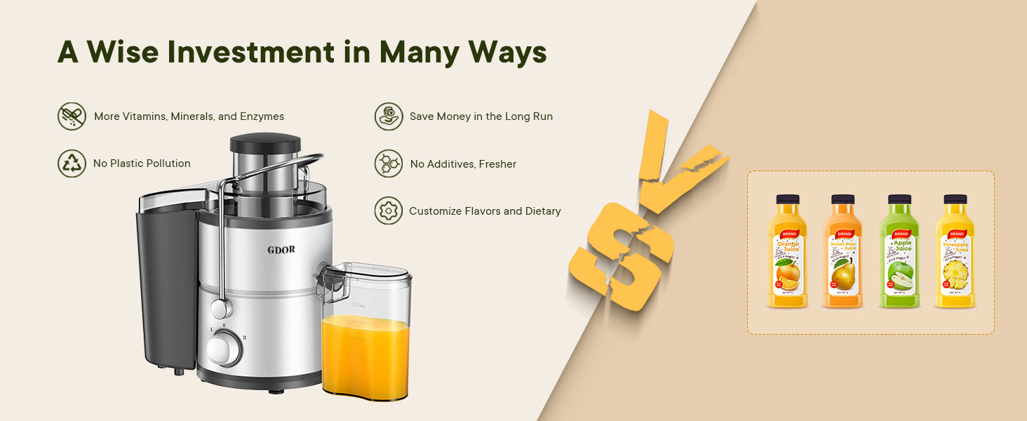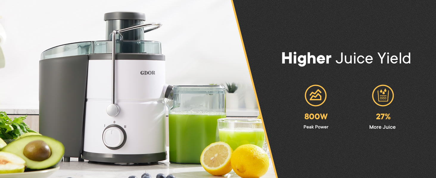 - The basic GDOR juicer features an 800W motor and extracts up to 27% more juice and 38% more vitamins and minerals. With this juicer, you can make a cup of homemade juice with less pulp and foam in just a few seconds. Additionally, it includes a 17 oz juice jug and a cleaning brush for convenience