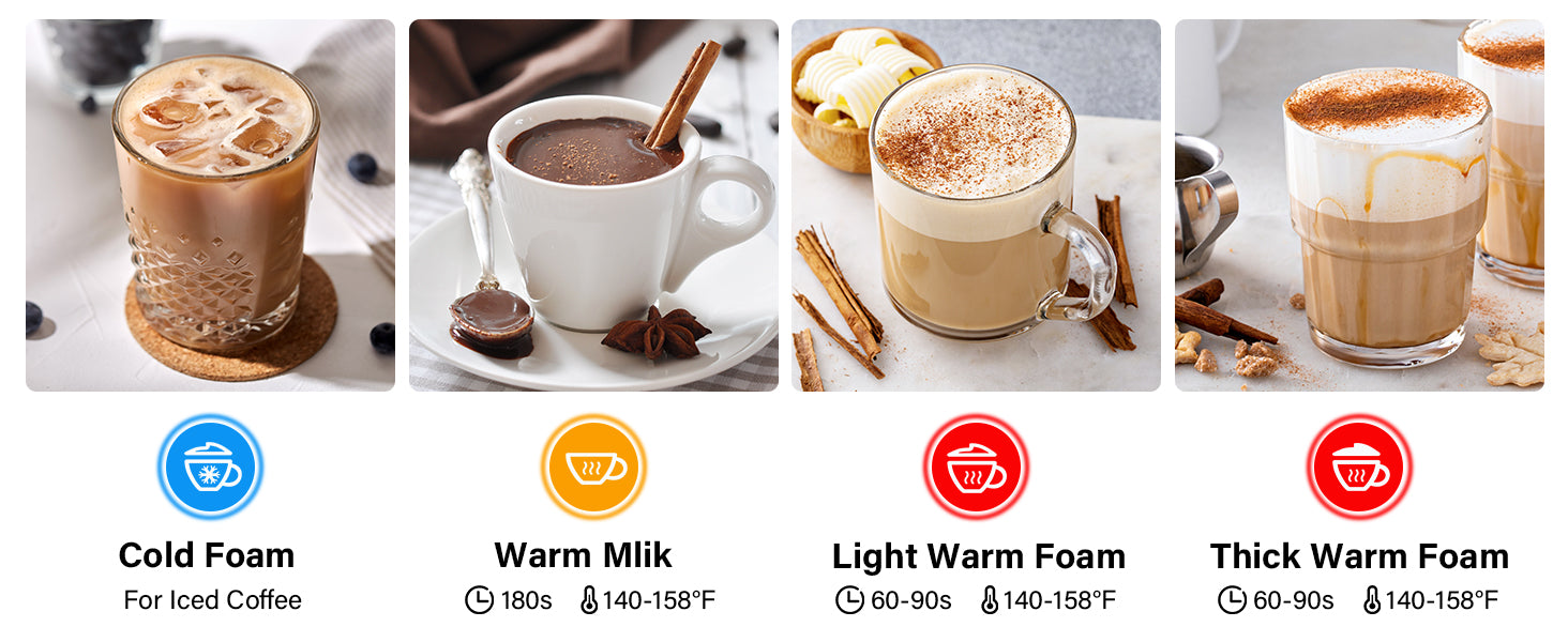 - 【4-in-1 Multifunctional Milk Frother】Create your favorite coffeehouse drinks at home with four versatile modes: Cold Foam, Warm Light Foam, Warm Thick Foam, and Warm Milk — perfect for lattes, cappuccinos, macchiatos, and more