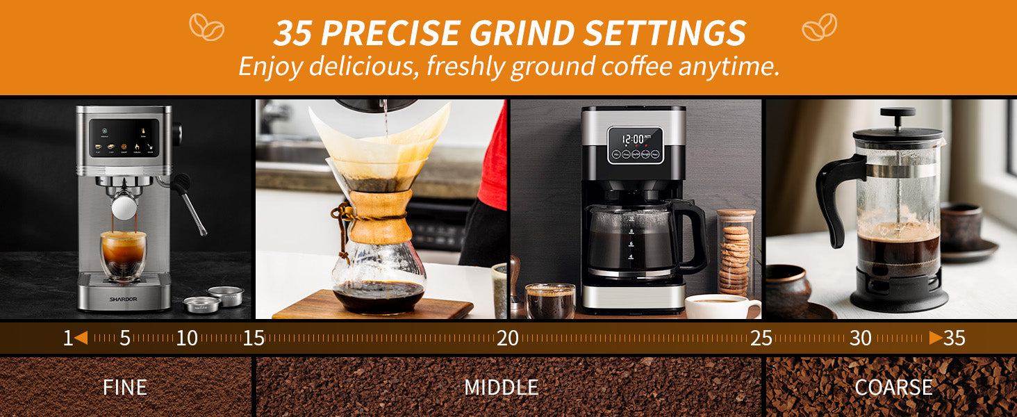 - 35 Precision Grinding: Adjustable burr grinder with multiple grind size settings from fine to coarse, perfect for various brewing methods including espresso, drip, and French press
