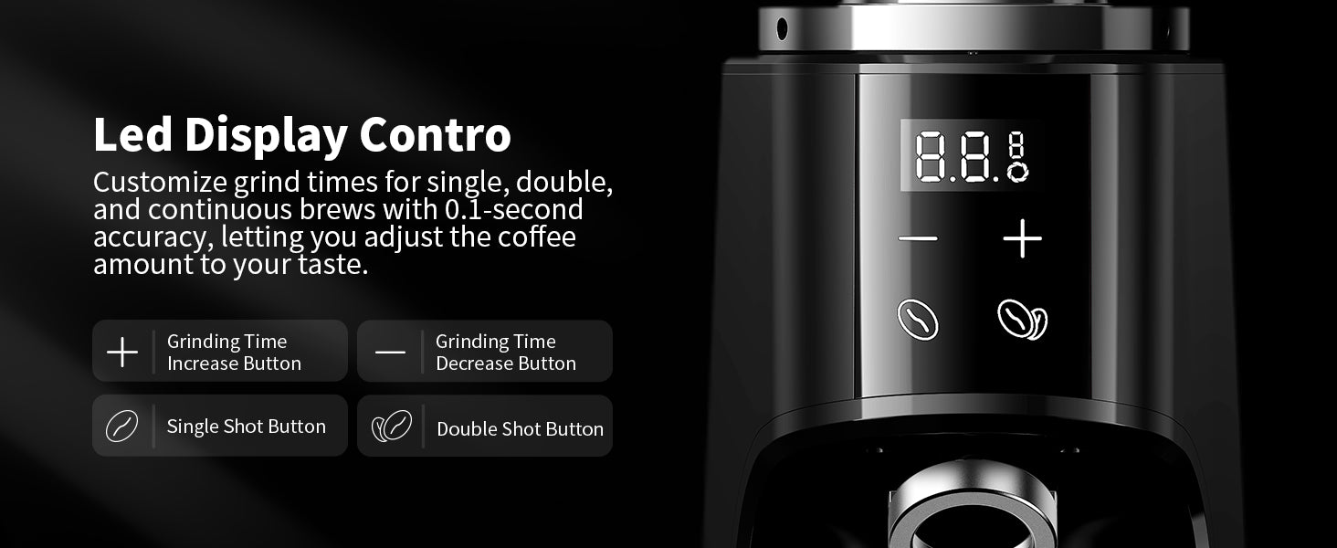 - LED Display Control: Customize grind times for single, double, and continuous brews with 0.1-second accuracy, letting you adjust the coffee amount to your taste