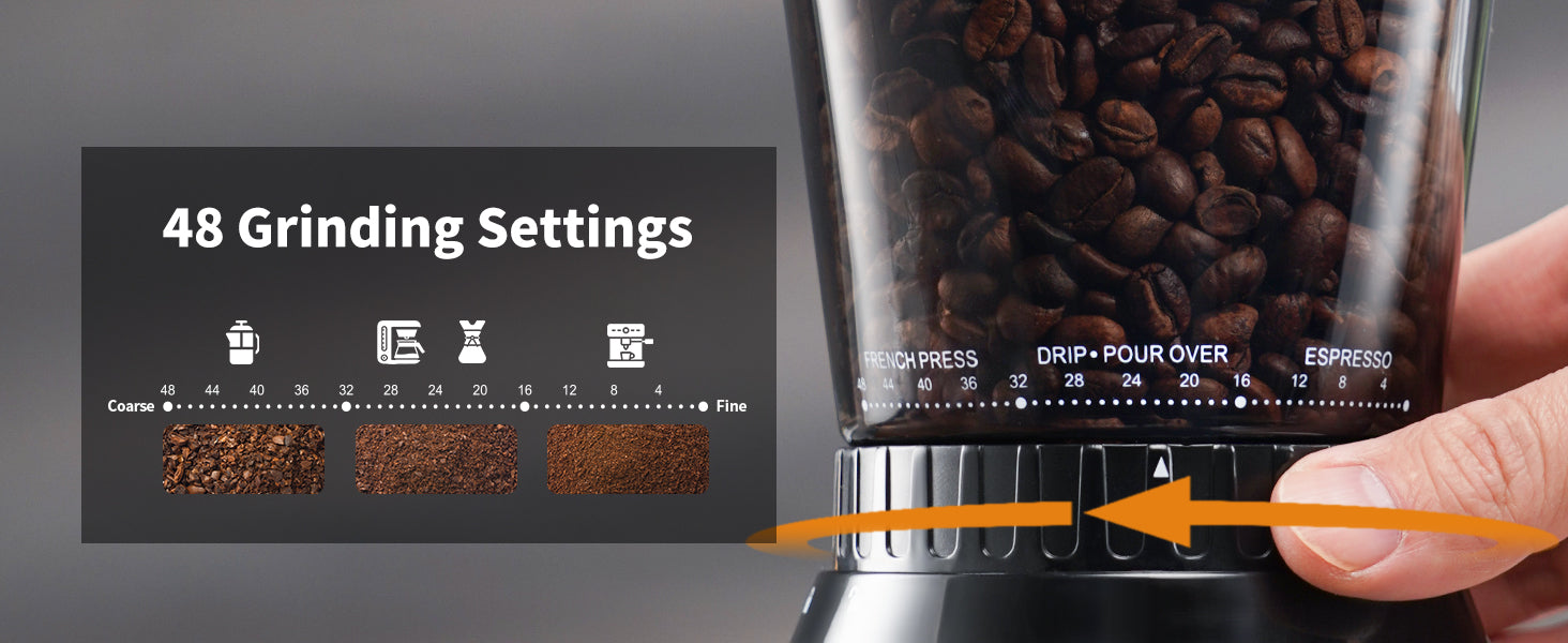 Precise Grinding Settings: 48 Kinds of grinding selections can accurately adjust the gap between electric burr bean grinder internal burrs, fully ensuring that the grinding of each setting is suitable for different brewing method, from the finest espresso to the coarsest french press grind to suit your grinding needs.