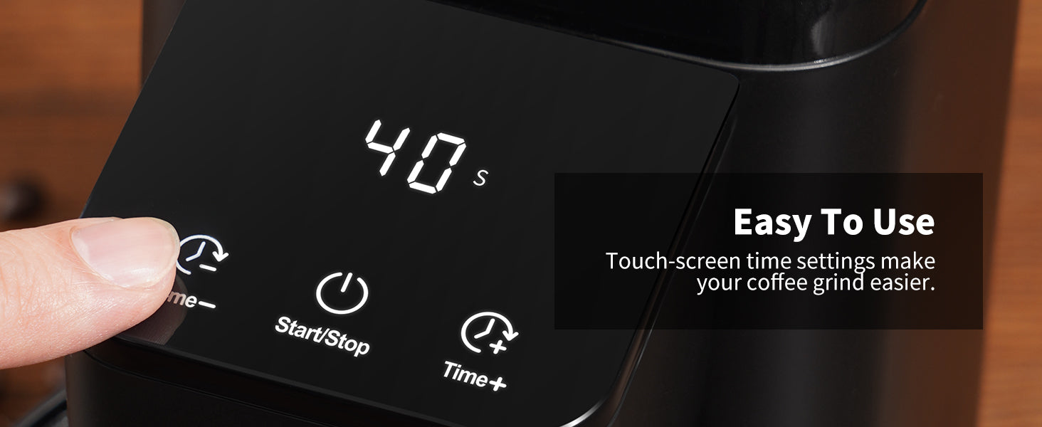 Easy to Control: 40 sec precision electronic timer and the clear digital display allows you to easily and intuitively adjust grinding time, but also features touch-sensitive switches and time adjustment for easy operation .