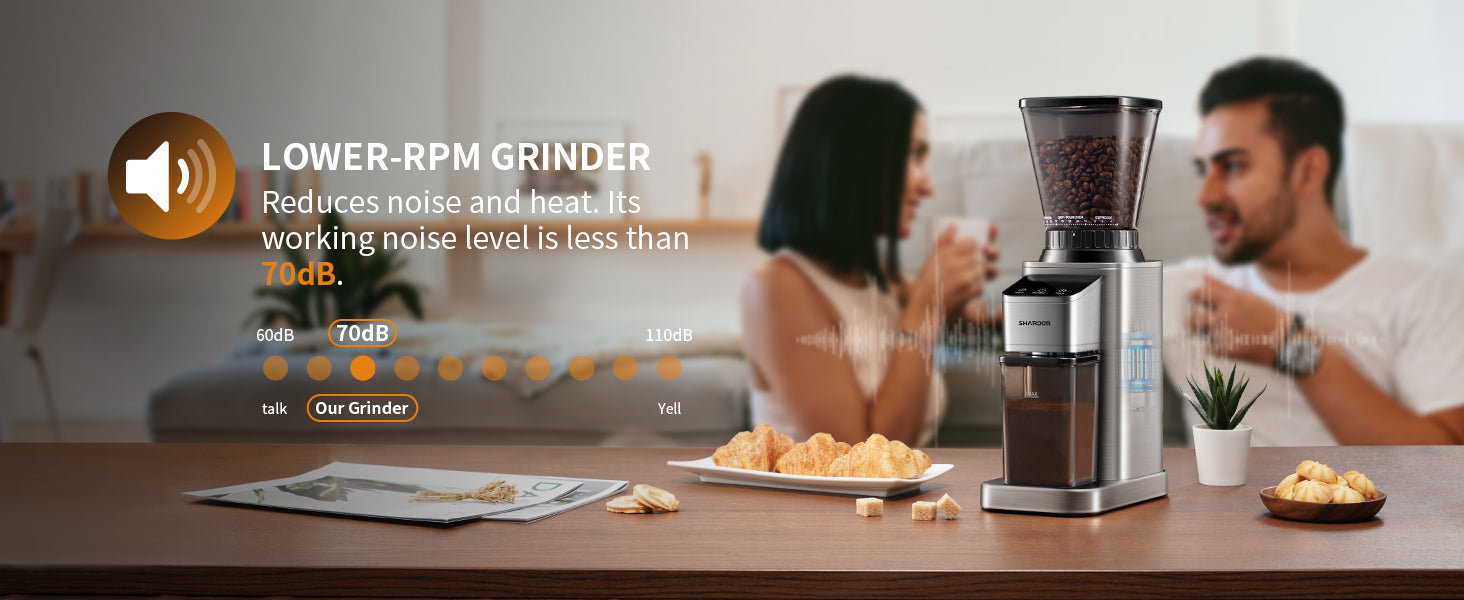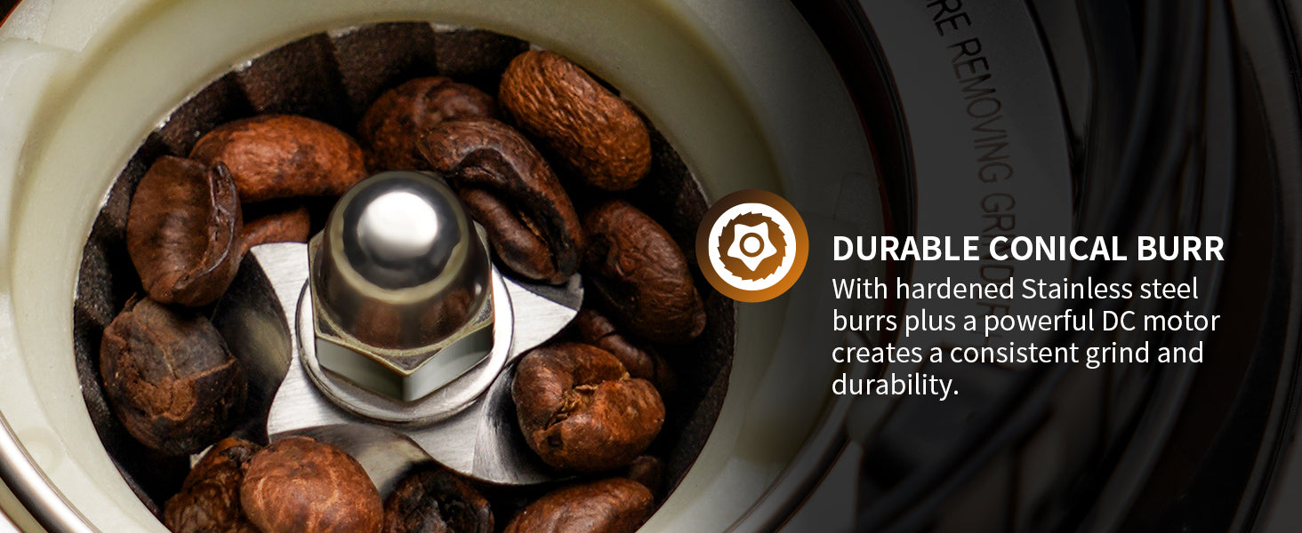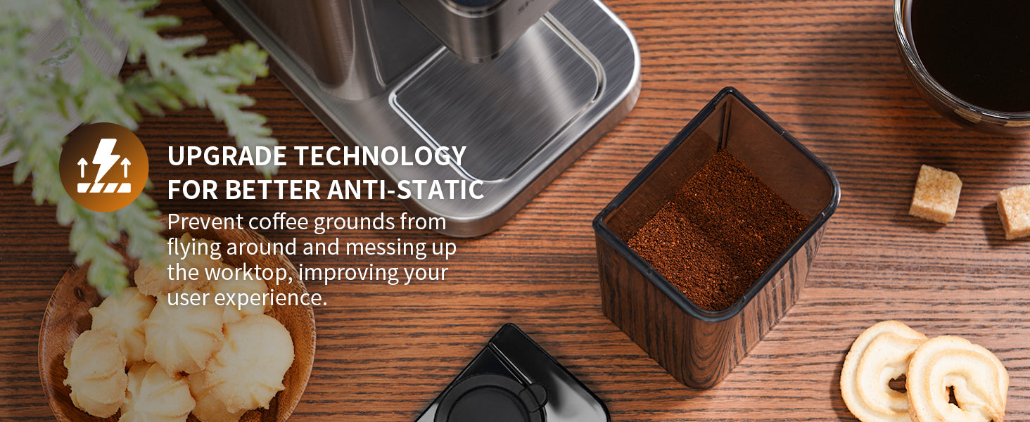 UPGRADE ANTI-STATIC CONICAL BURR COFFEE GRINDER: The anti-static technology prevents the grounds from sticking to the coffee chamber and creating a mess. It allows a smooth flow of coffee grounds for an improved experience.