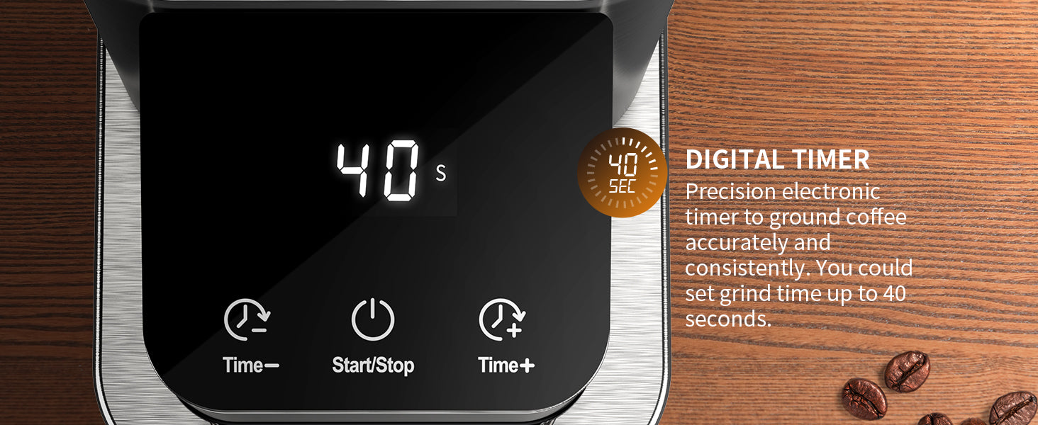 PRECISION ELECTRONIC TIMER & TOUCHSCREEN PANEL: Precision Electronic Timer allows users to adjust grind time in 1 second increments up to 40s. A clear and concise LCD Touch screen is easy and intuitive for you to adjust the grind time.