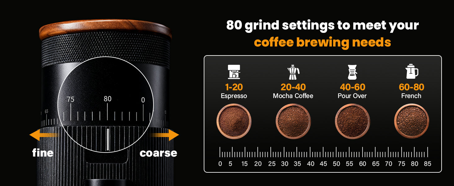 - 80 adjustable settings for versatile brewing: Covers grind sizes from ultra-fine (for espresso) to coarse (for cold brew/French press), adapting to various brewing methods and meeting diverse home coffee needs.