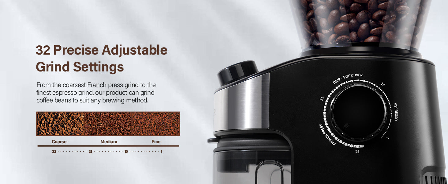 32 Precise Grind Size Settings: From the finest espresso grind to the coarsest French press, all your grinding needs are covered.